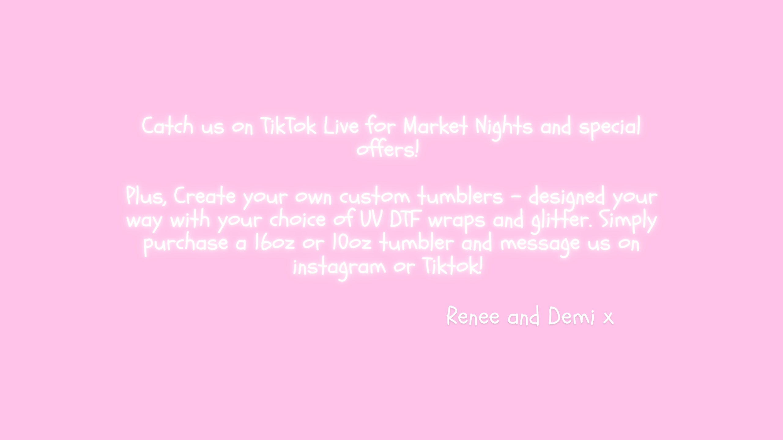 Meet Renee and Demi, two best friends who first connected on TikTok over their shared love for creativity and entrepreneurship. What began as an online friendship quickly blossomed into a successful business partnership. Together, they now run a growing business that specializes in UV DTF wraps and glitter, offering unique products for crafters and small businesses. Outside of work, they cherish spending quality time with friends and family, often hosting game nights filled with fun and laughter. Excited to grow their business and continue making memories, Renee and Demi are ready to take their entrepreneurial journey to the next level!